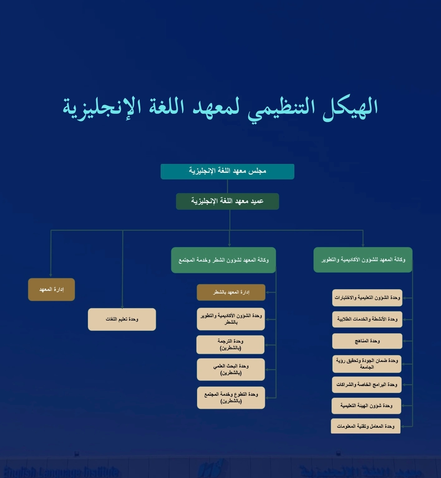 و يعمل معهد اللغة الانجليزية تحت قيادة كادر إداري مكون من عميد المعهد ووكيلة المعهد للشؤون الأكاديمية للتطوير ووكيلة المعهد لشؤون الشطر وخدمة المجتمع بشطر الطالبات و مديري الإدارتين و كادر إداري في مختلف الوحدات.