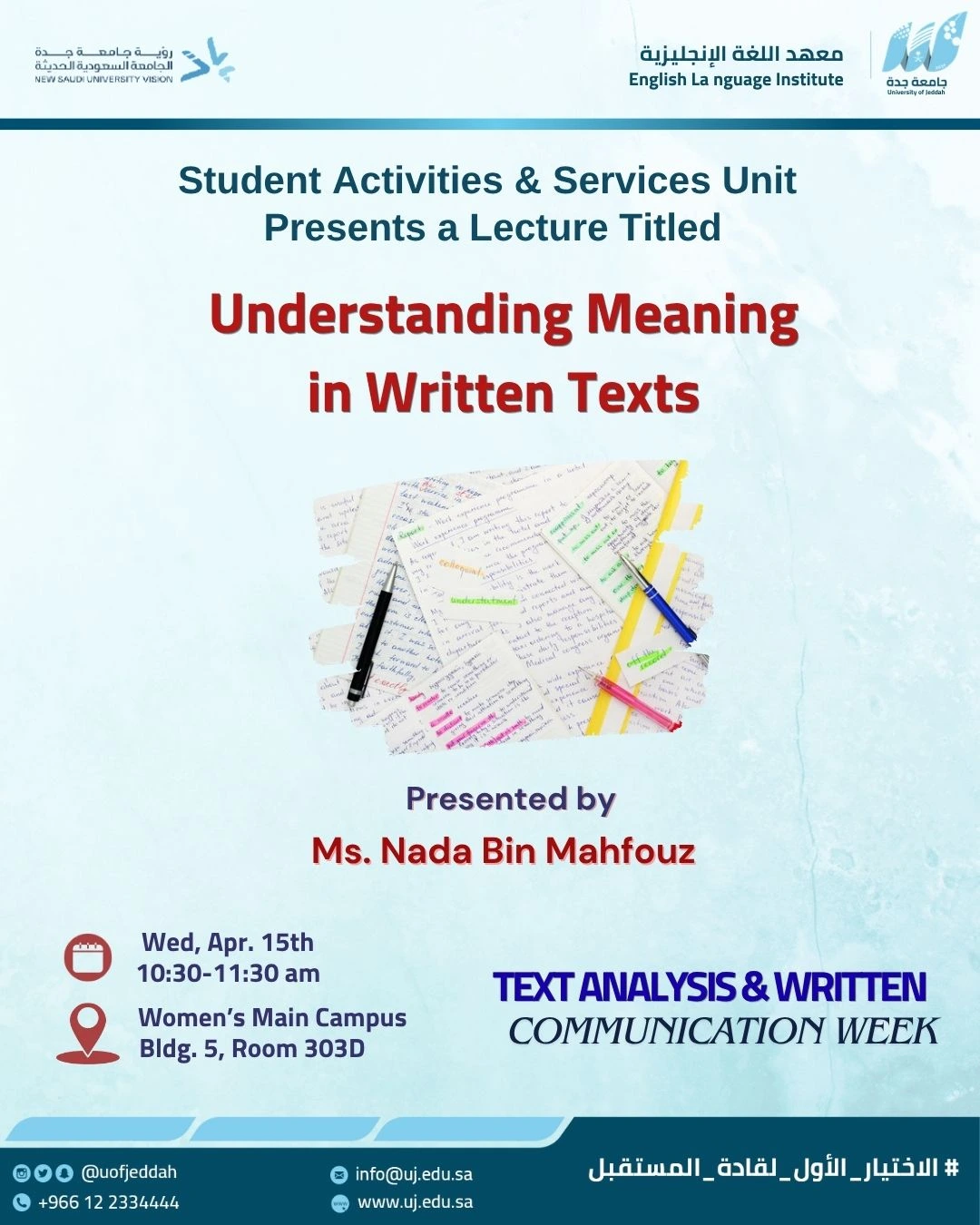 ضمن أسبوع تحليل النصوص والتواصل الكتابي، تدعوكم وحدة الأنشطة والخدمات الطلابية بمعهد اللغة الإنجليزية لحضور محاضرة بعنوان:
