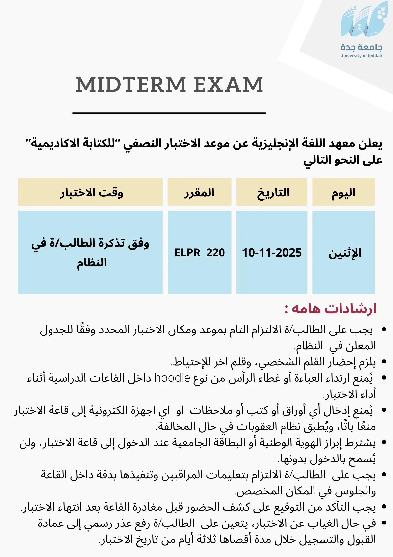 إعلان اختبار الكتابة النصفي لمادة الكتابة الأكاديمية ELPR220